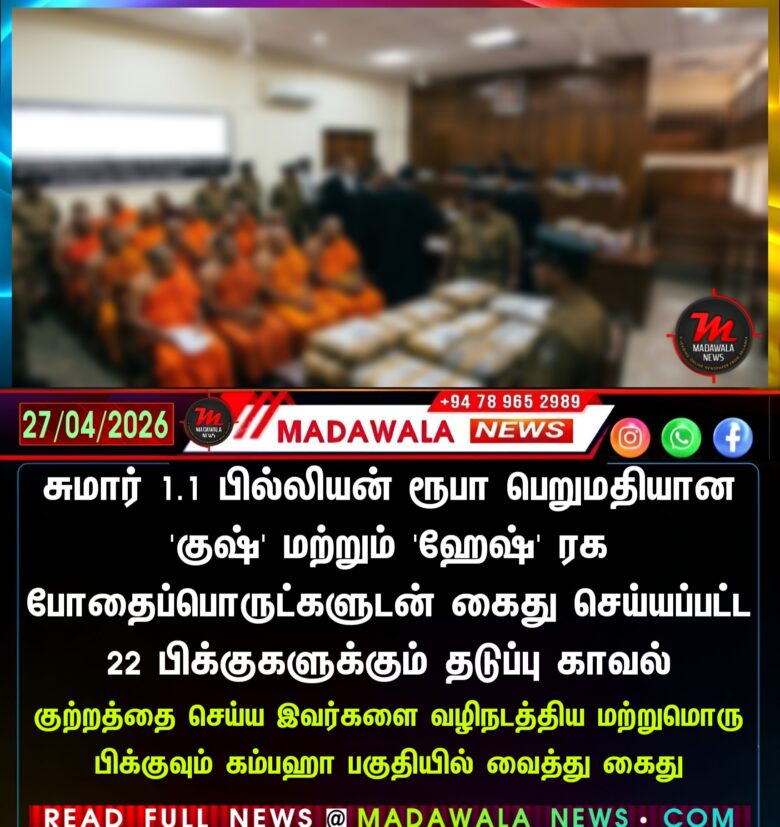 சுமார் 1.1 பில்லியன் ரூபா பெறுமதியான ‘குஷ்’ மற்றும் ‘ஹேஷ்’ ரக போதைப்பொருட்களுடன் கைது செய்யப்பட்ட 22 பிக்குகளுக்கும் தடுப்பு காவல் – குற்றத்தை செய்ய இவர்களை வழிநடத்திய மற்றுமொரு பிக்குவும் கம்பஹா பகுதியில் வைத்து கைது