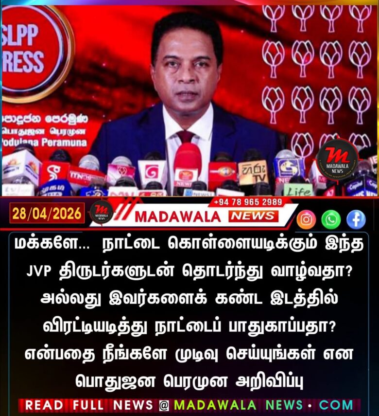 மக்களே… நாட்டை கொள்ளையடிக்கும் இந்த JVP திருடர்களுடன் தொடர்ந்து வாழ்வதா? அல்லது இவர்களைக் கண்ட இடத்தில் விரட்டியடித்து நாட்டைப் பாதுகாப்பதா? என்பதை நீங்களே முடிவு செய்யுங்கள் என பொதுஜன பெரமுன அறிவிப்பு