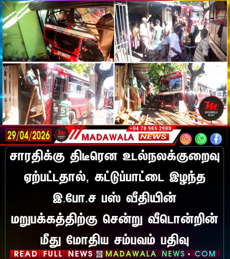 சாரதிக்கு திடீரென உடல்நலக்குறைவு ஏற்பட்டதால், கட்டுப்பாட்டை இழந்த இ.போ.ச பஸ் வீதியின் மறுபக்கத்திற்கு சென்று வீடொன்றின் மீது மோதிய சம்பவம் பதிவு