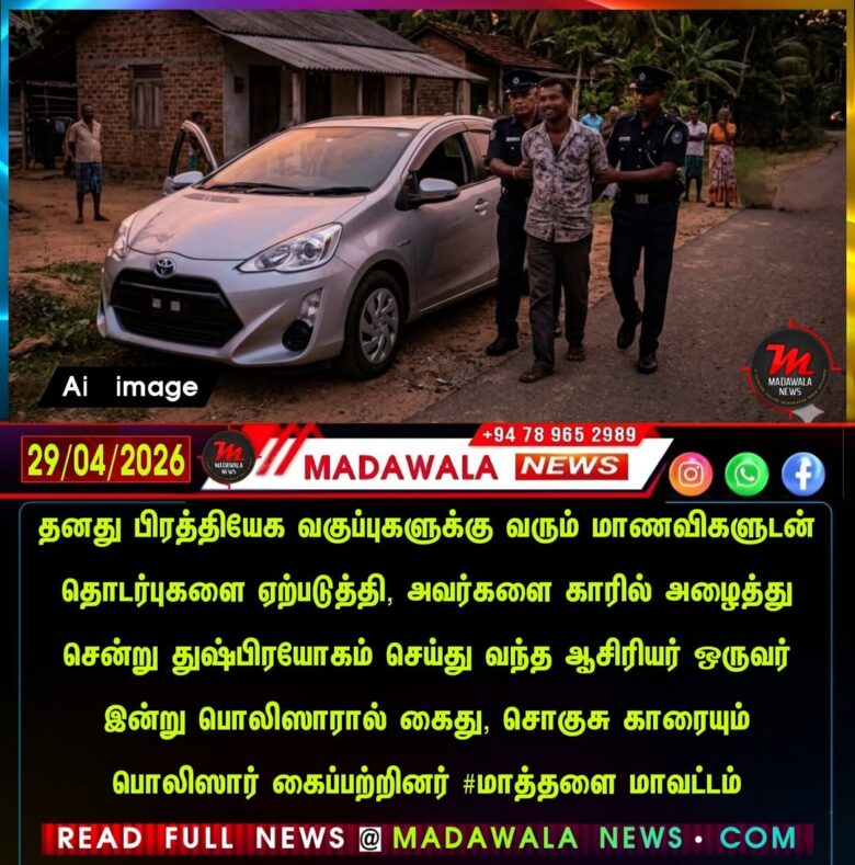 தனது பிரத்தியேக வகுப்புகளுக்கு வரும் மாணவிகளுடன் தொடர்புகளை ஏற்படுத்தி, அவர்களை காரில் அழைத்து சென்று துஷ்பிரயோகம் செய்து வந்த ஆசிரியர் ஒருவர் இன்று பொலிஸாரால் கைது, சொகுசு காரையும் பொலிஸார் கைப்பற்றினர் #மாத்தளை மாவட்டம்