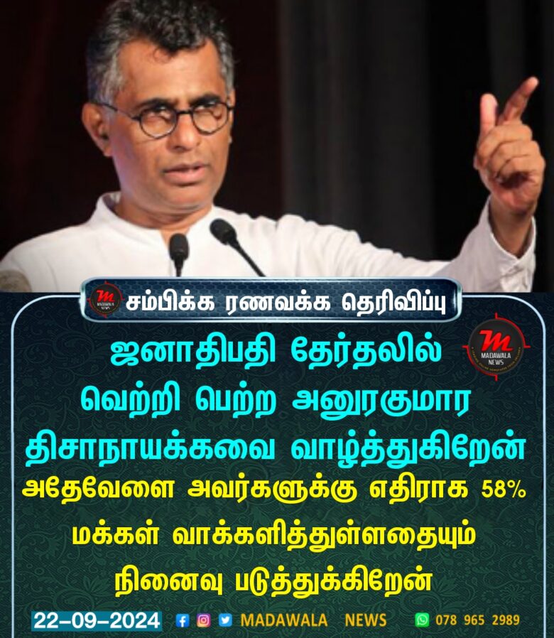 ஜனாதிபதி தேர்தலில் வெற்றி பெற்ற அனுரகுமார திசாநாயக்கவை வாழ்த்துகிறேன் – அதேவேளை அவர்களுக்கு எதிராக 58% மக்கள் வாக்களித்துள்ளதையும் நினைவு படுத்துக்கிறேன் ; சம்பிக்க