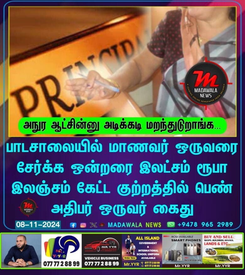 பாடசாலையில் மாணவர் ஒருவரை சேர்க்க ஒன்றரை இலட்சம் ரூபா இலஞ்சம் கேட்ட குற்றத்தில் பெண் அதிபர் ஒருவர் கைது.