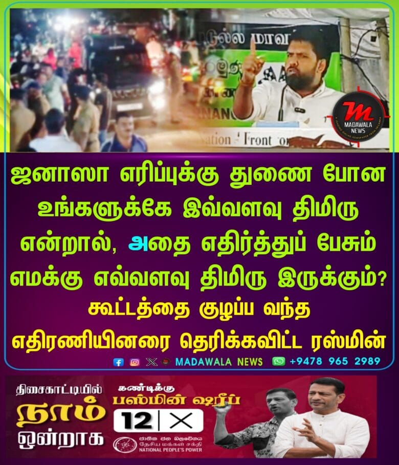 நேற்று 10.11.2024 சம்மாந்துறை ஹிஜ்ரா சந்திக்கு அருகில் ஏற்பாடு செய்யப்பட்டிருந்த பொதுக் கூட்டத்தில் மு.க மற்றும் அஇமக வை சேர்ந்த எம்.பிக்கள் செய்த சமூக துரோகங்கள், முஸ்லிம் சமூகத்திற்கு இழைக்கப்பட்ட துன்பங்கள் அனைத்தையும் பட்டியல் போட்டு பேசினார் ரஸ்மின். அப்போது அங்கே வந்த முஸ்லிம் காங்கிரஸ் வேட்பாளர் மன்சூரின் ஆதரவாளர்கள் சிலர் கூட்டத்தை குழப்ப முற்பட்ட நேரத்தில் பகிரங்க மேடையிலேயே பதிலடி வழங்கினார் ரஸ்மின்.