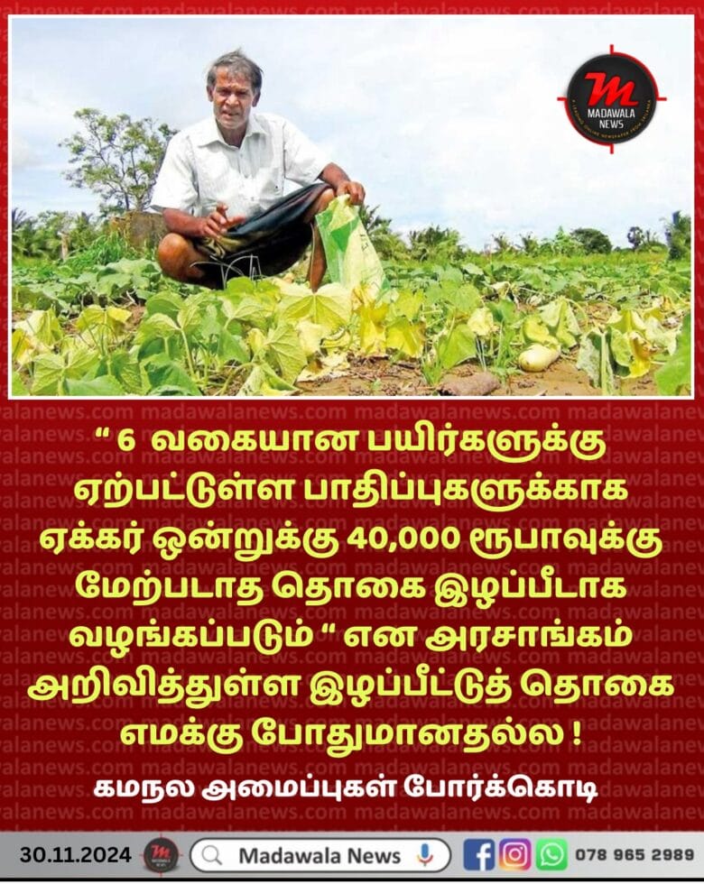 பயிர்களுக்கு ஏற்பட்டுள்ள சேதங்களுக்காக அரசாங்கம் அறிவித்துள்ள இழப்பீட்டுத் தொகை தங்களுக்கு போதுமானதல்ல !