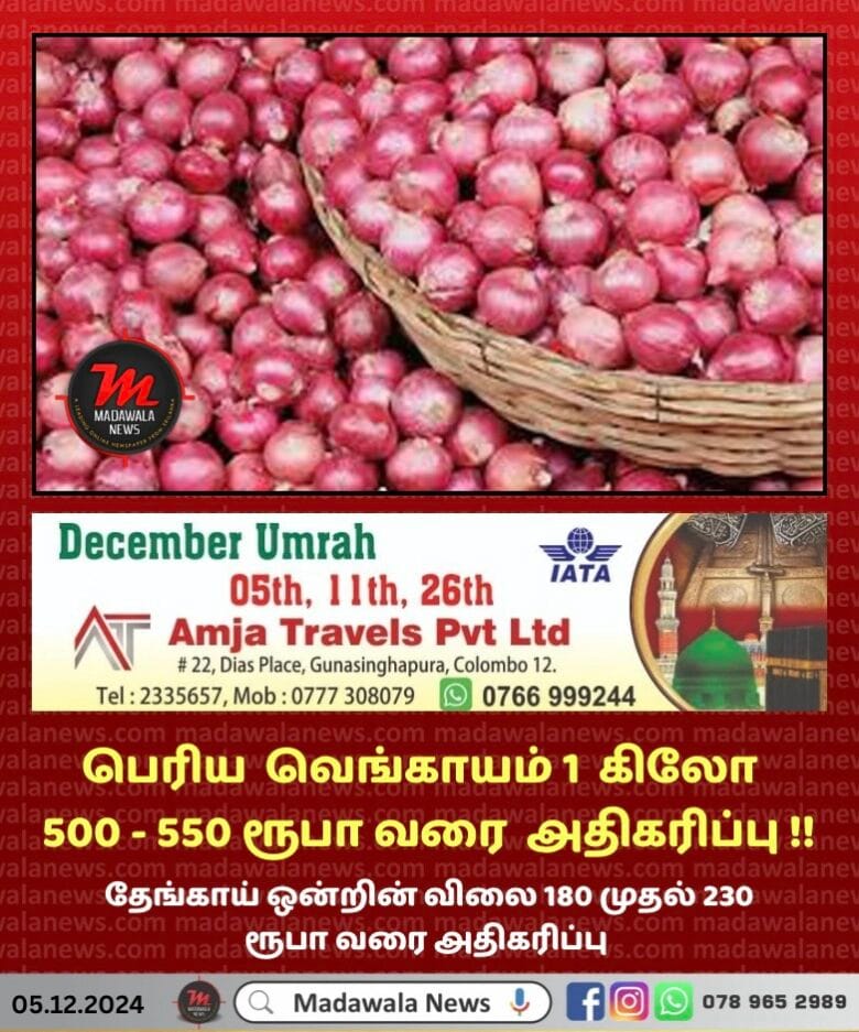 இன்று (5) பிற்பகல் வரை ஒரு கிலோ இந்திய வெங்காயத்தின் விலை 500 முதல் 550 ரூபா வரை அதிகரித்துள்ளதாகவும், தேங்காய் ஒன்றின் விலை 180 முதல் 230 ரூபா வரை அதிகரித்துள்ளதாகவும் நுகர்வோர் தெரிவிக்கின்றனர்.