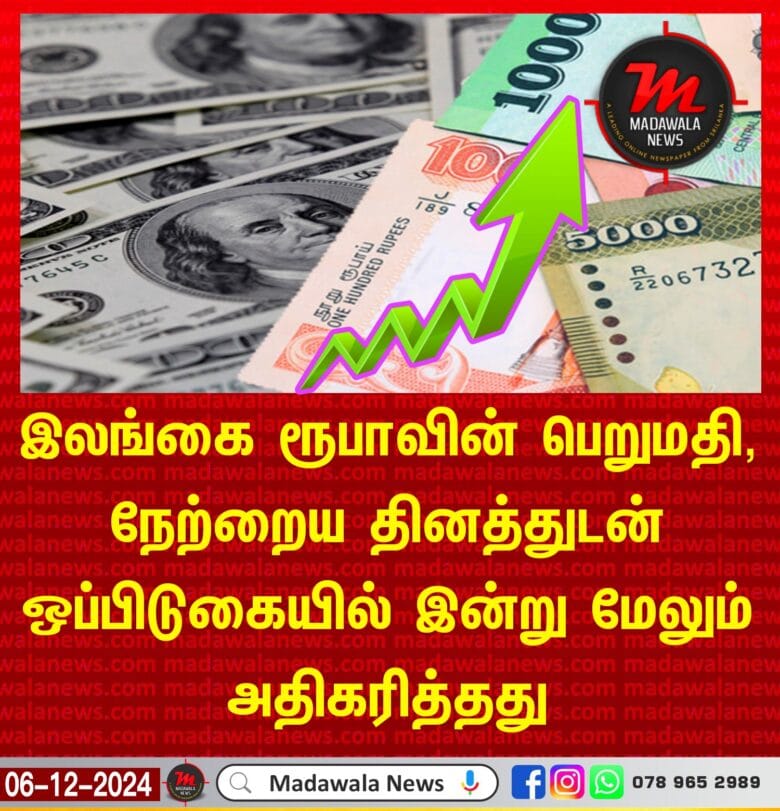 அமெரிக்க டொலருக்கு நிகராக இலங்கை ரூபாவின் பெறுமதியானது நேற்றைய தினத்துடன் ஒப்பிடுகையில் இன்று (06) மேலும் அதிகரித்துள்ளது.