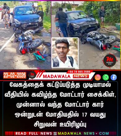 வேகத்தைக் கட்டுப்படுத்த முடியாமல் வீதியில் கவிழ்ந்த மோட்டார் சைக்கிள், முன்னால் வந்த மோட்டார் கார் ஒன்றுடன் மோதியதில் 17 வயது சிறுவன் உயிரிழப்பு