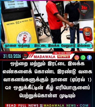 ஒற்றை மற்றும் இரட்டை இலக்க எண்களைக் கொண்ட இரண்டு வகை வாகனங்களுக்கும் நாளை (ஏப்ரல் 1) QR ஒதுக்கீட்டின் கீழ் எரிபொருளைப் பெற்றுக்கொள்ள முடியும்