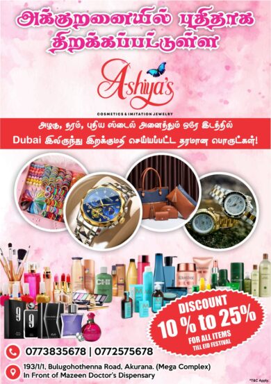Ashiya’s Cosmetics & Imitation jewellery அக்குறணையில் நாளை (புதன்) பிரம்மாண்டமான புதிய திறப்பு விழா!