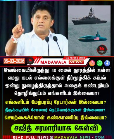 இலங்கையிலிருந்து 40 மைல் தூரத்தில் உள்ள எமது கடல் எல்லைக்குள் நீர்மூழ்கிக் கப்பல் ஒன்று நுழைந்திருந்தால் அதைக் கண்டறியும் தொழில்நுட்பம் எங்களிடம் இல்லையா? எங்களிடம் மேற்பரப்பு ரேடார்கள் இல்லையா? நீருக்கடியில் சோனார் நெட்வொர்க்குகள் இல்லையா? செயற்கைக்கோள் கண்காணிப்பு இல்லையா? சஜித் பிரேமதாச சரமாரியாக கேள்வி