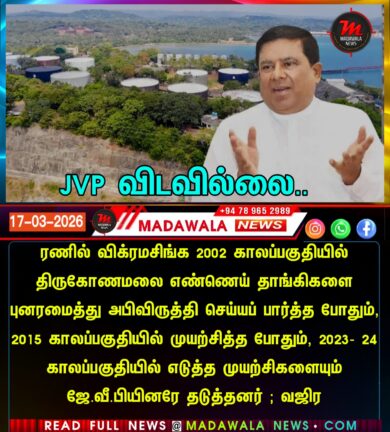 ரணில் விக்ரமசிங்க 2002 காலப்பகுதியில் திருகோணமலை எண்ணெய் தாங்கிகளை புனரமைத்து அபிவிருத்தி செய்யப் பார்த்த போதும், 2015 காலப்பகுதியில் முயற்சித்த போதும், 2024 காலப்பகுதியில் எடுத்த முயற்சிகளையும் ஜே.வீ.பியினரே தடுத்தனர் ; வஜிர