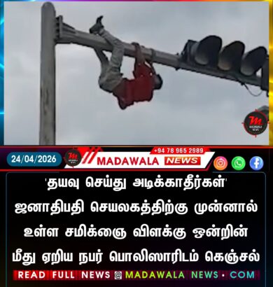 ‘தயவுசெய்து அடிக்காதீர்கள்’ ஜனாதிபதி செயலகத்திற்கு முன்னால் உள்ள சமிக்ஞை விளக்கு ஒன்றின் மீது ஏறிய நபர் பொலிஸாரிடம் கெஞ்சல்